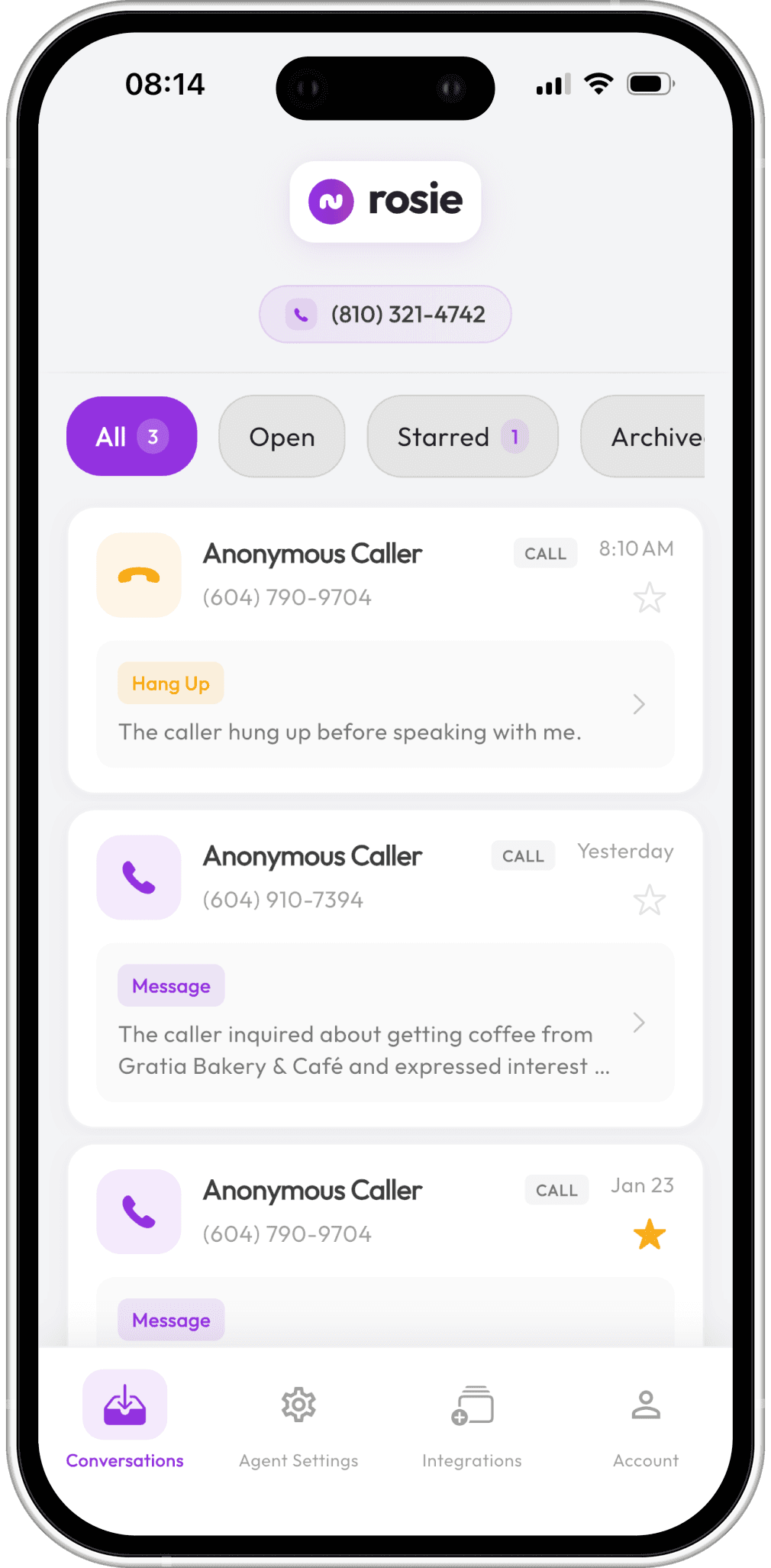 Rosie screens and blocks 1-800s, robocalls, and sales reps, only spending time on important calls.