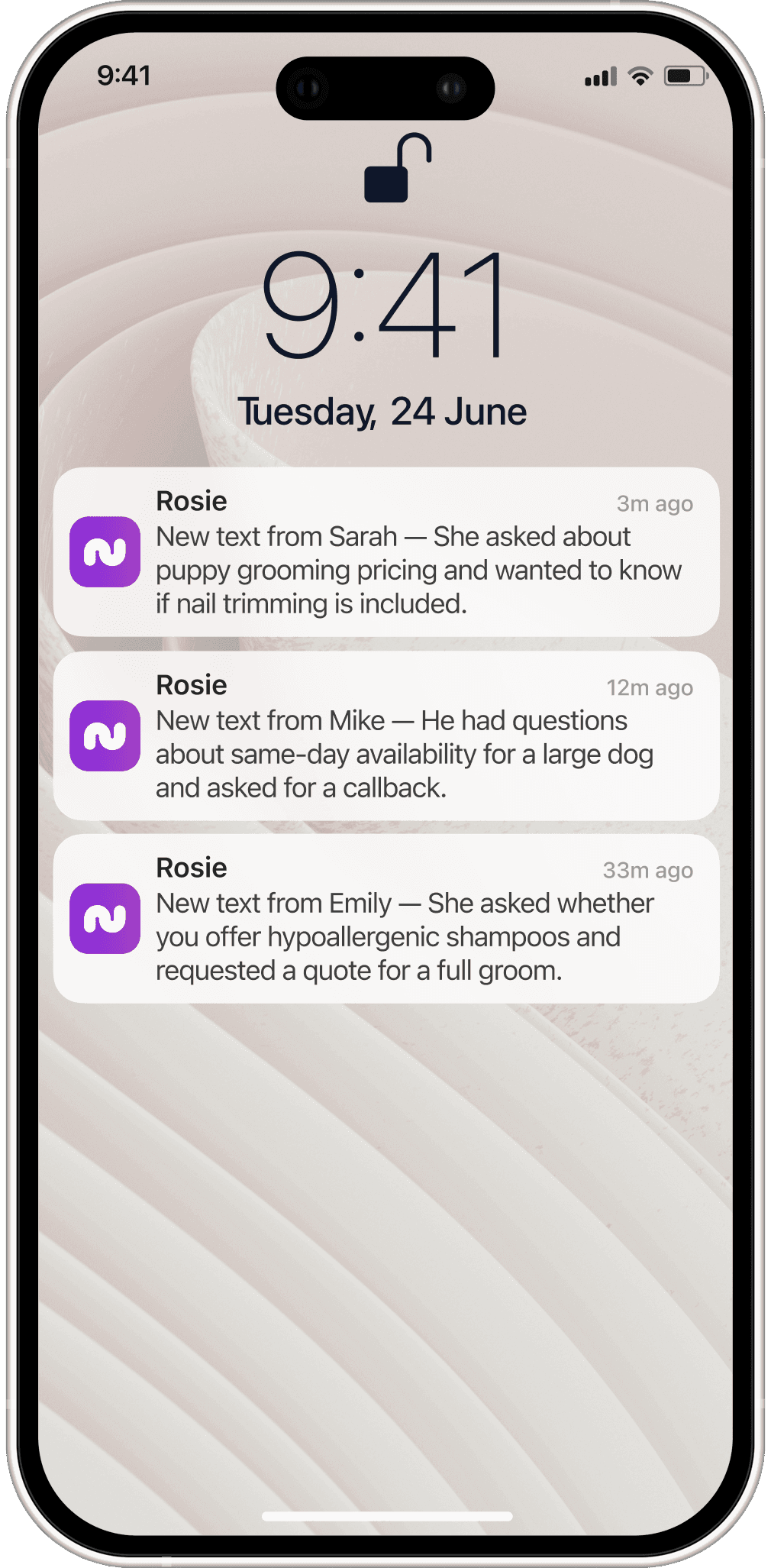Rosie gives prospects the answers they need, books appointments, and keeps you in the loop.