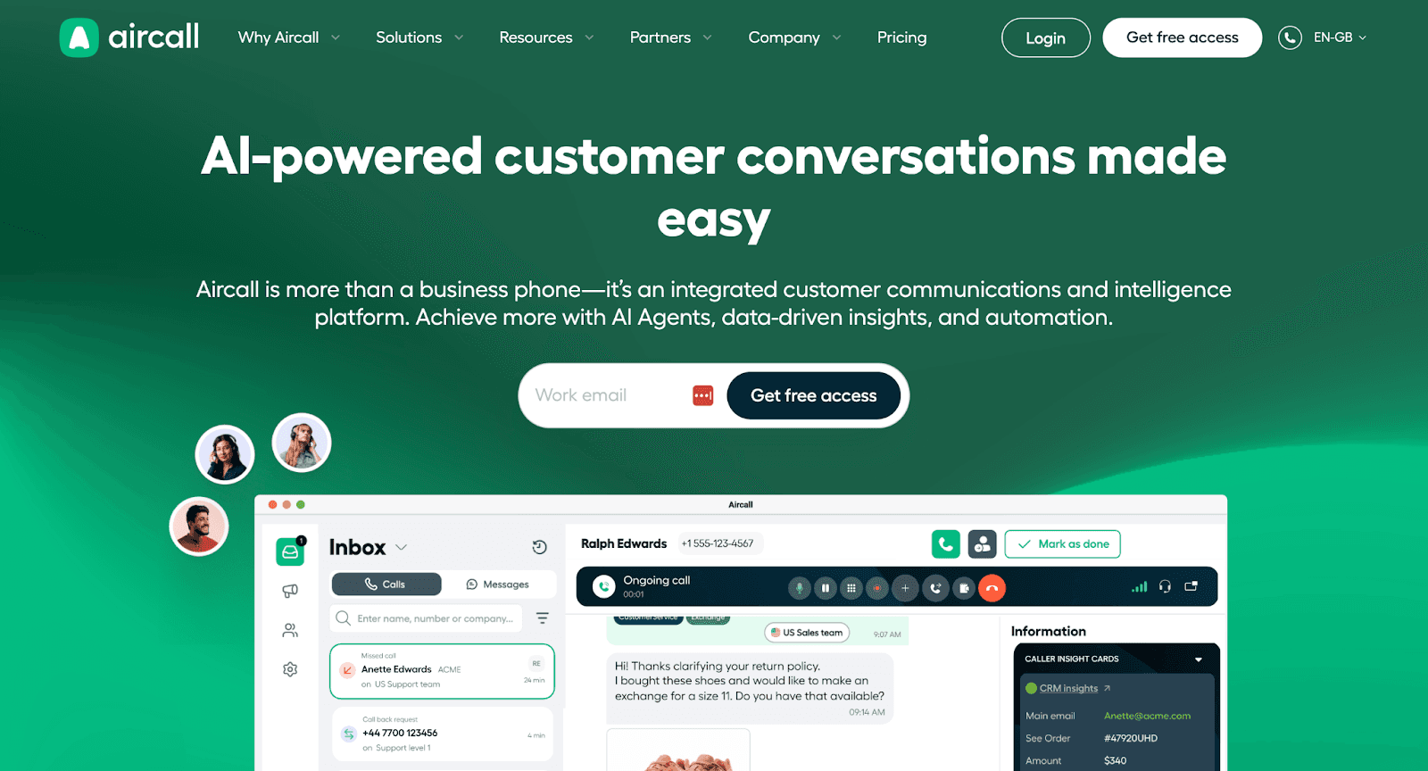 Aircall is a cloud-based phone system for sales and support teams. Its auto-attendant, CRM integrations, and analytics make it ideal for companies that rely on efficient inbound and outbound customer communication.