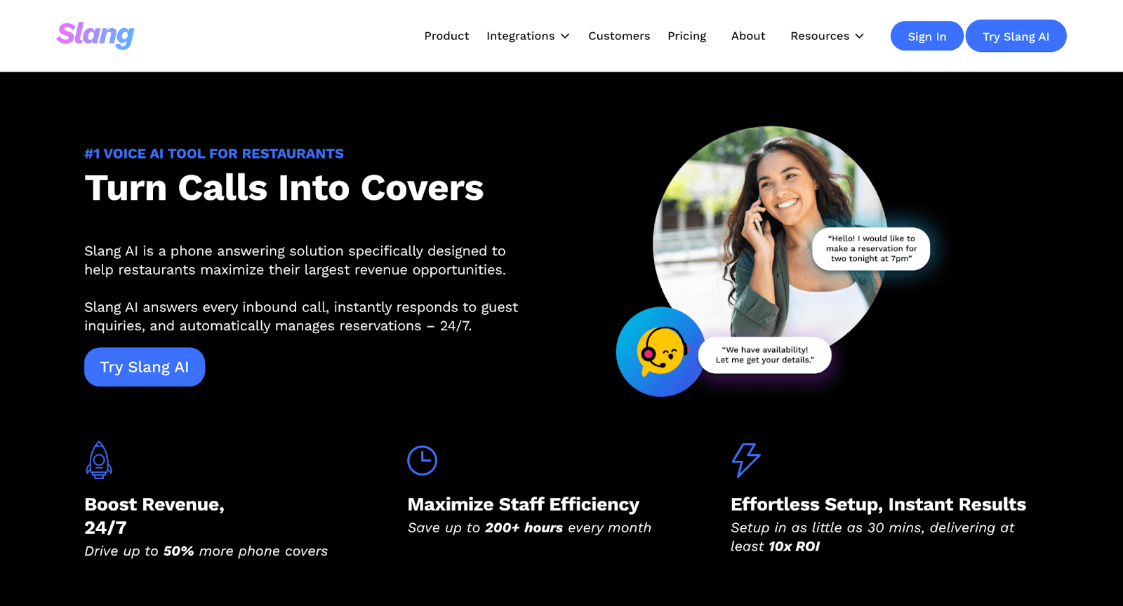 Slang.ai | Restaurants & hospitality | AI reservations, FAQ handling, multilingual support | $399 per month |