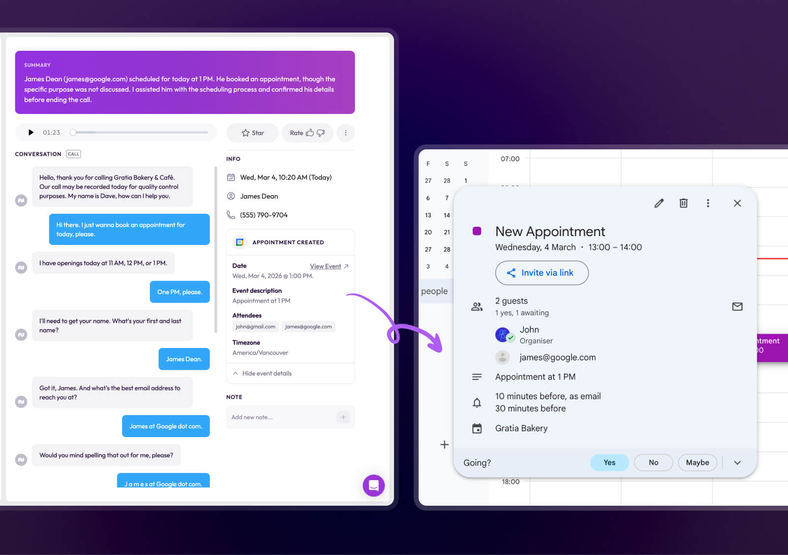 You get an email notification with the call summary and appointment details. When you check your calendar in the morning, the appointment is already there.