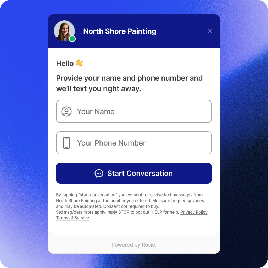 Add Rosie’s text widget to your website. Visitors will provide their name and phone number, and Rosie will text with them to capture leads, answer customer questions, and grow your business.